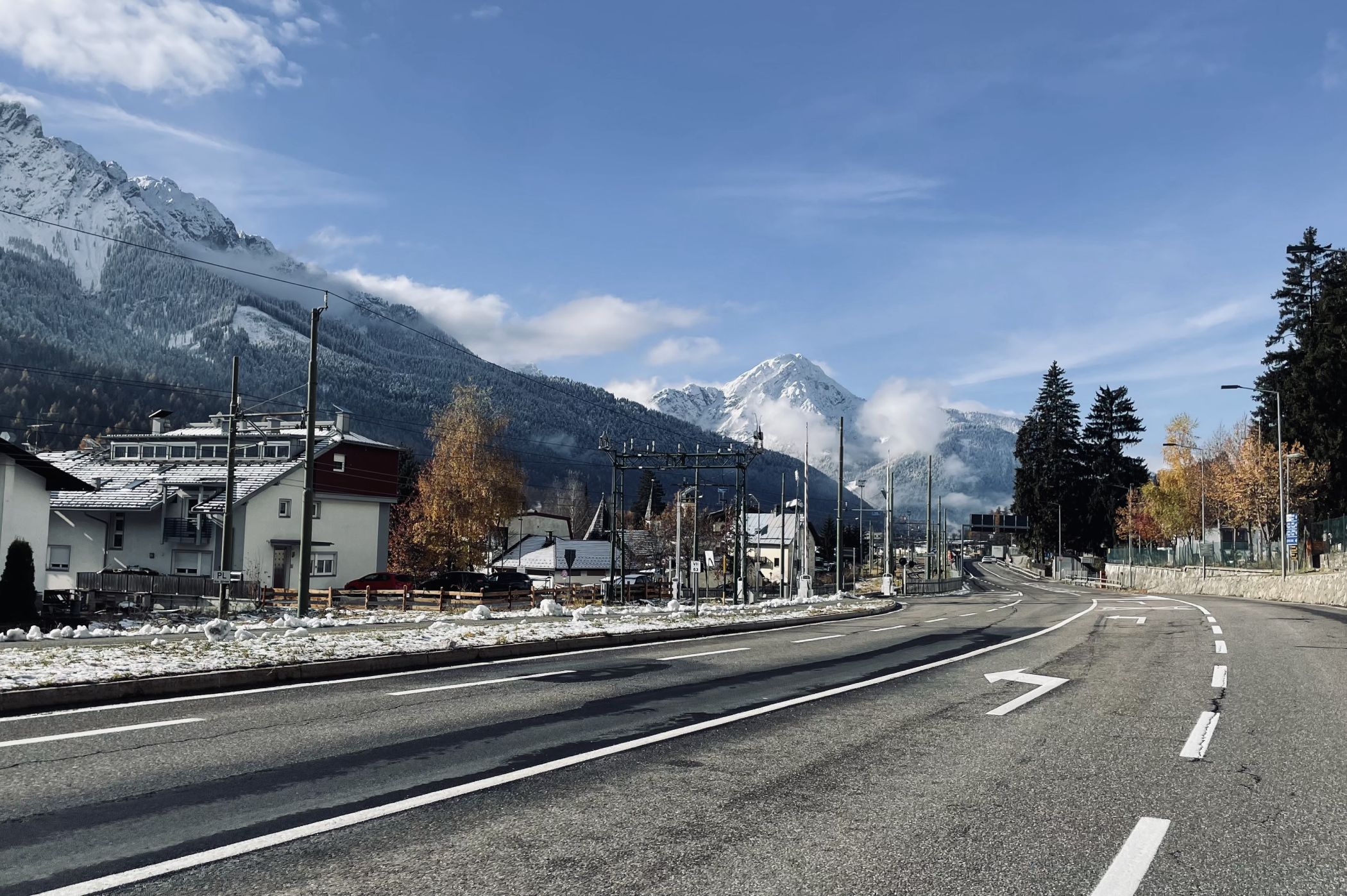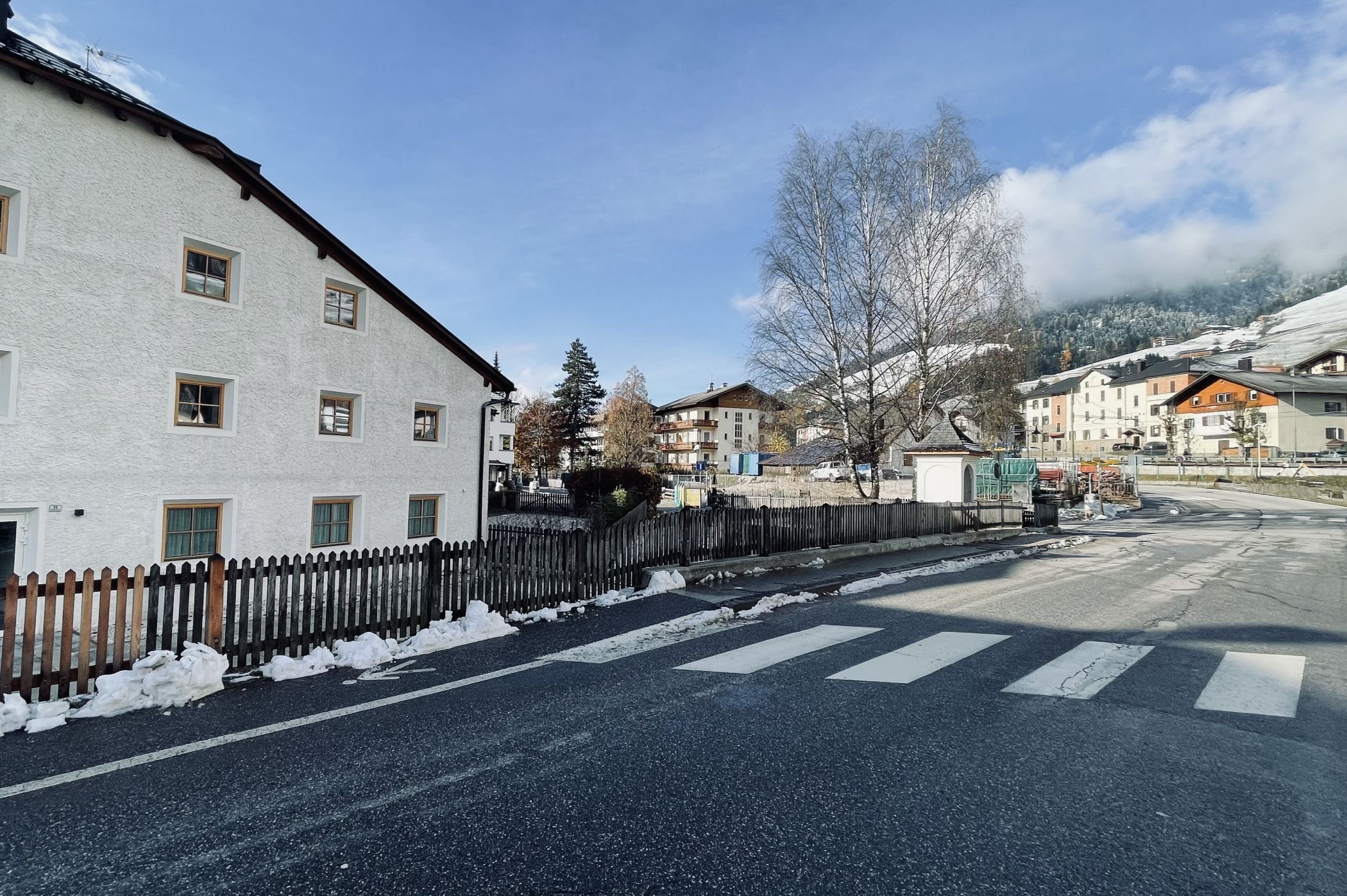 Von Pustertaler Staatsstraße links nach Innichen Ortsmitte einbiegen und die Bahngleise überqueren