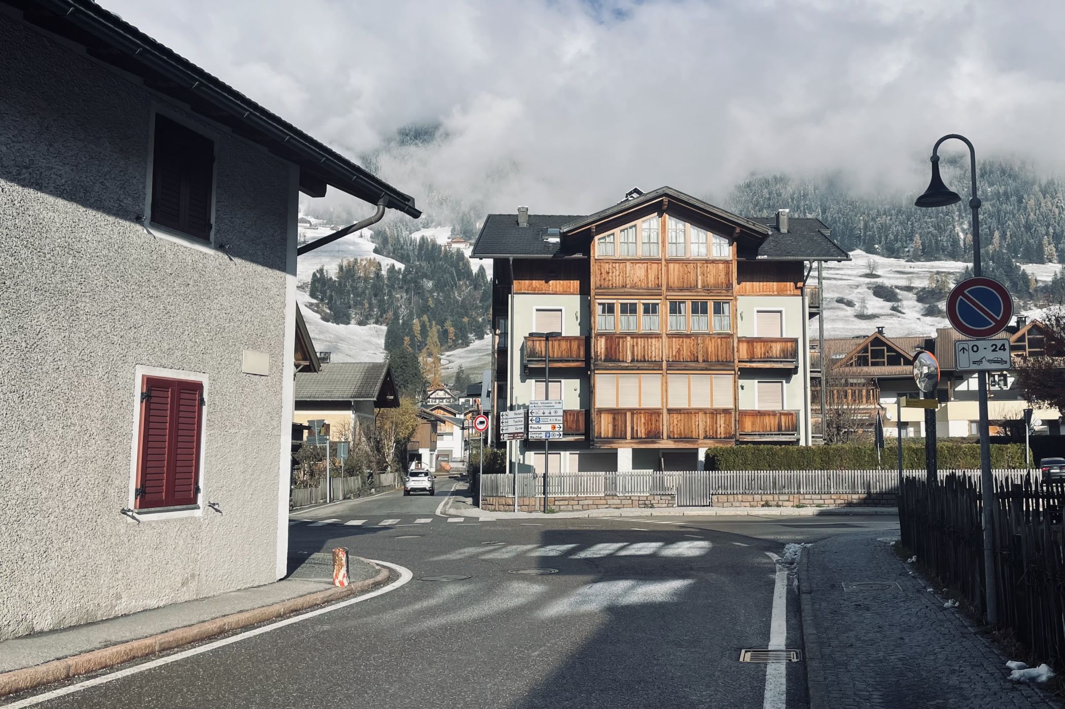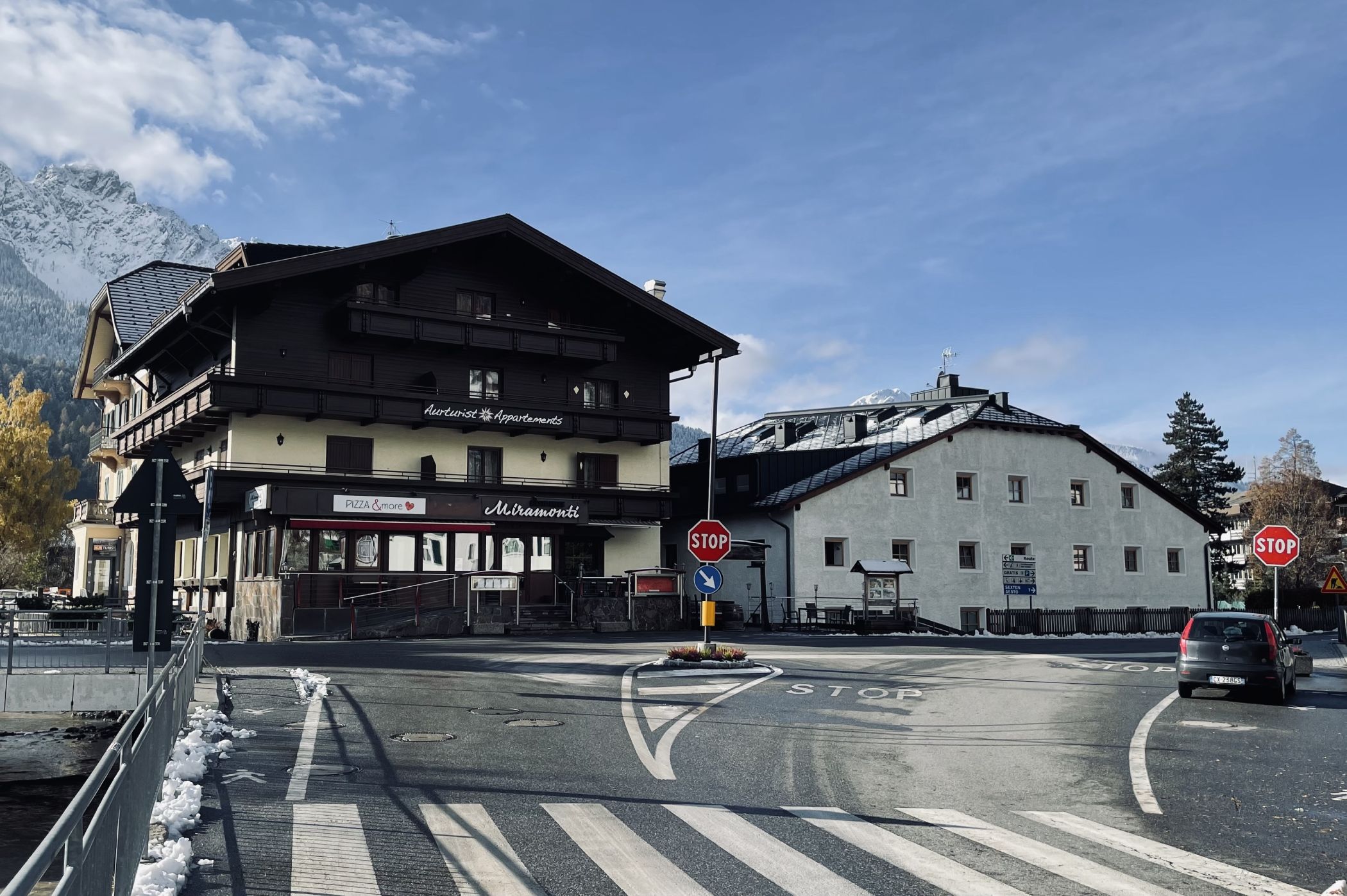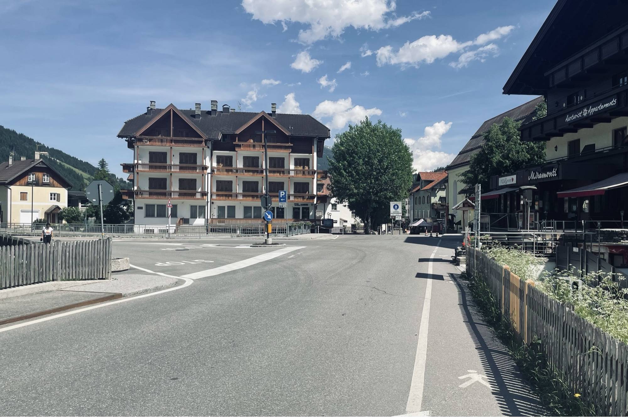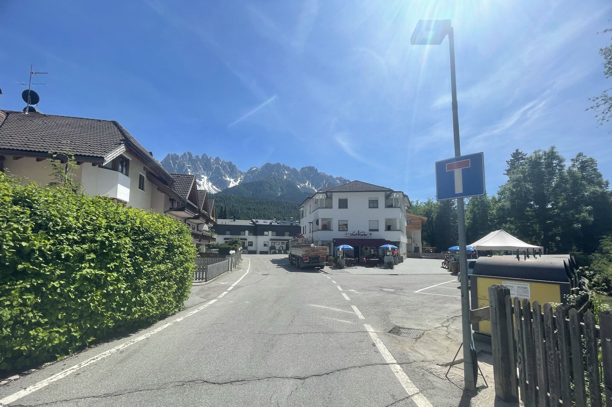 An der Kreuzung fahren Sie gerade aus Richtung Dorfzentrum (Achtung: nicht dem Straßenverlauf Richtung Toblach folgen!)