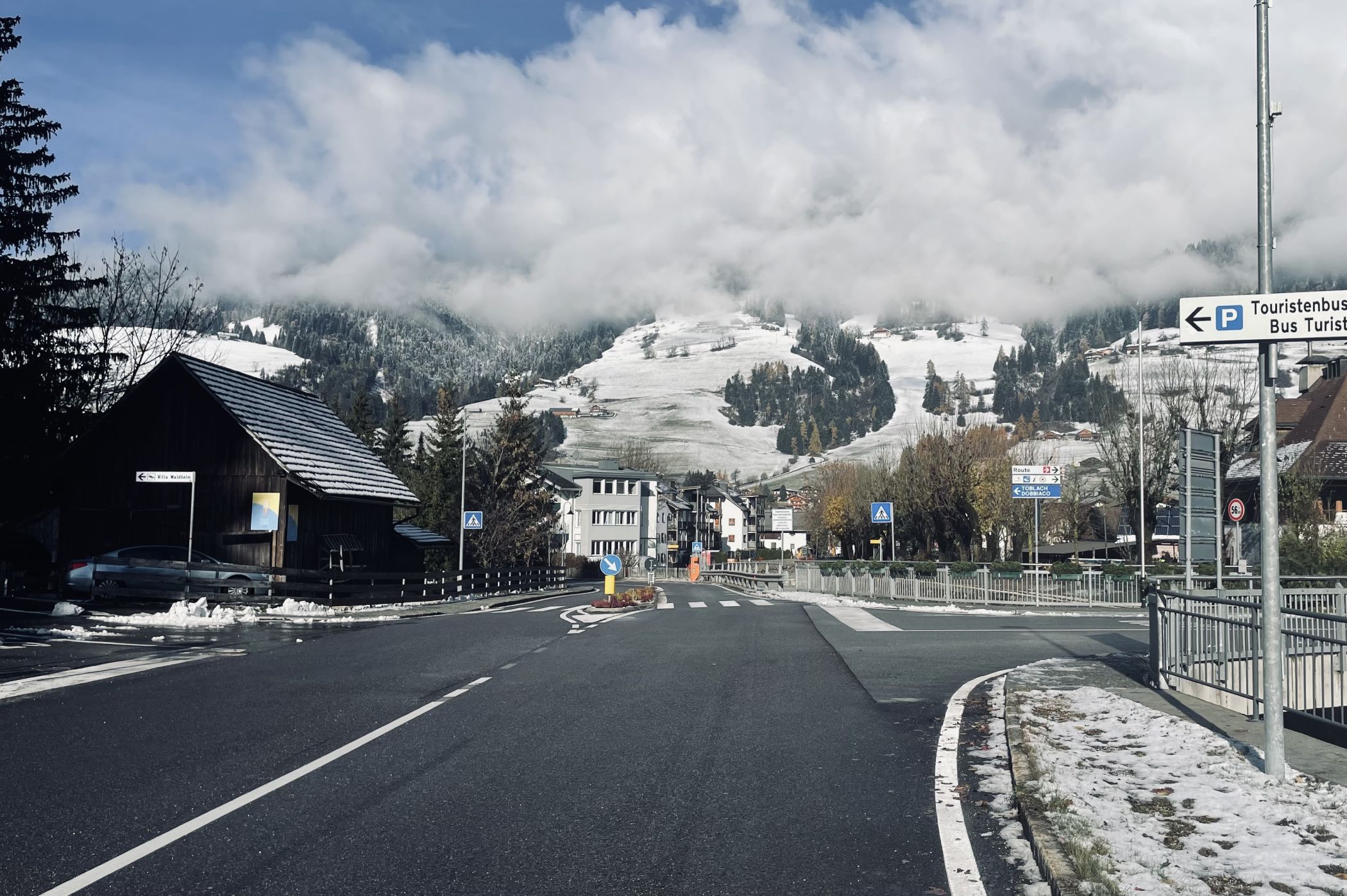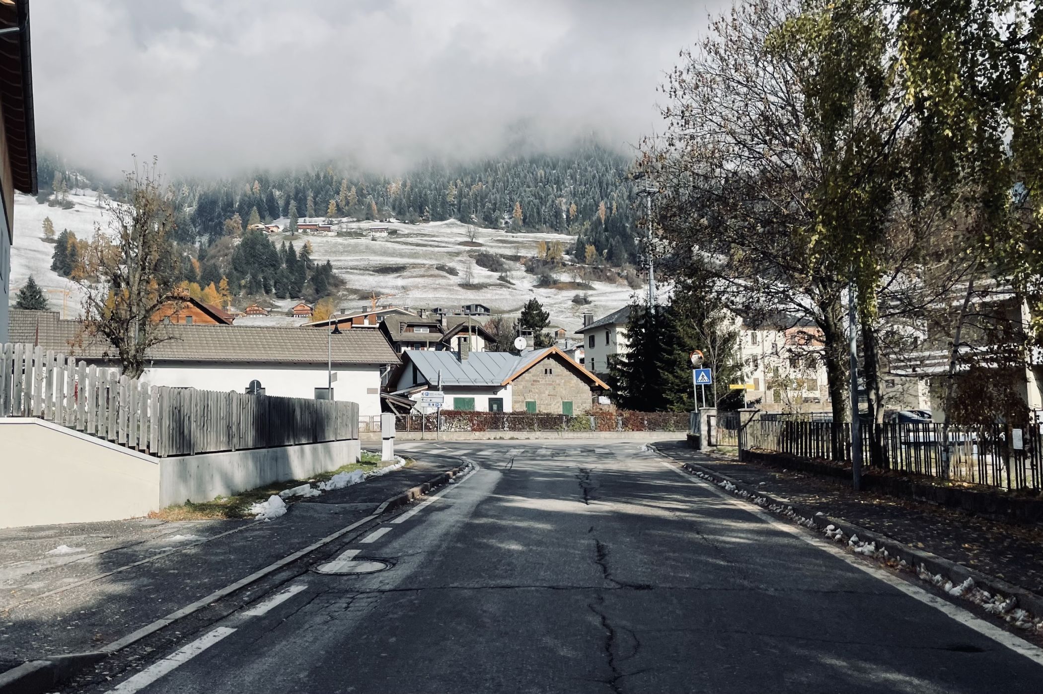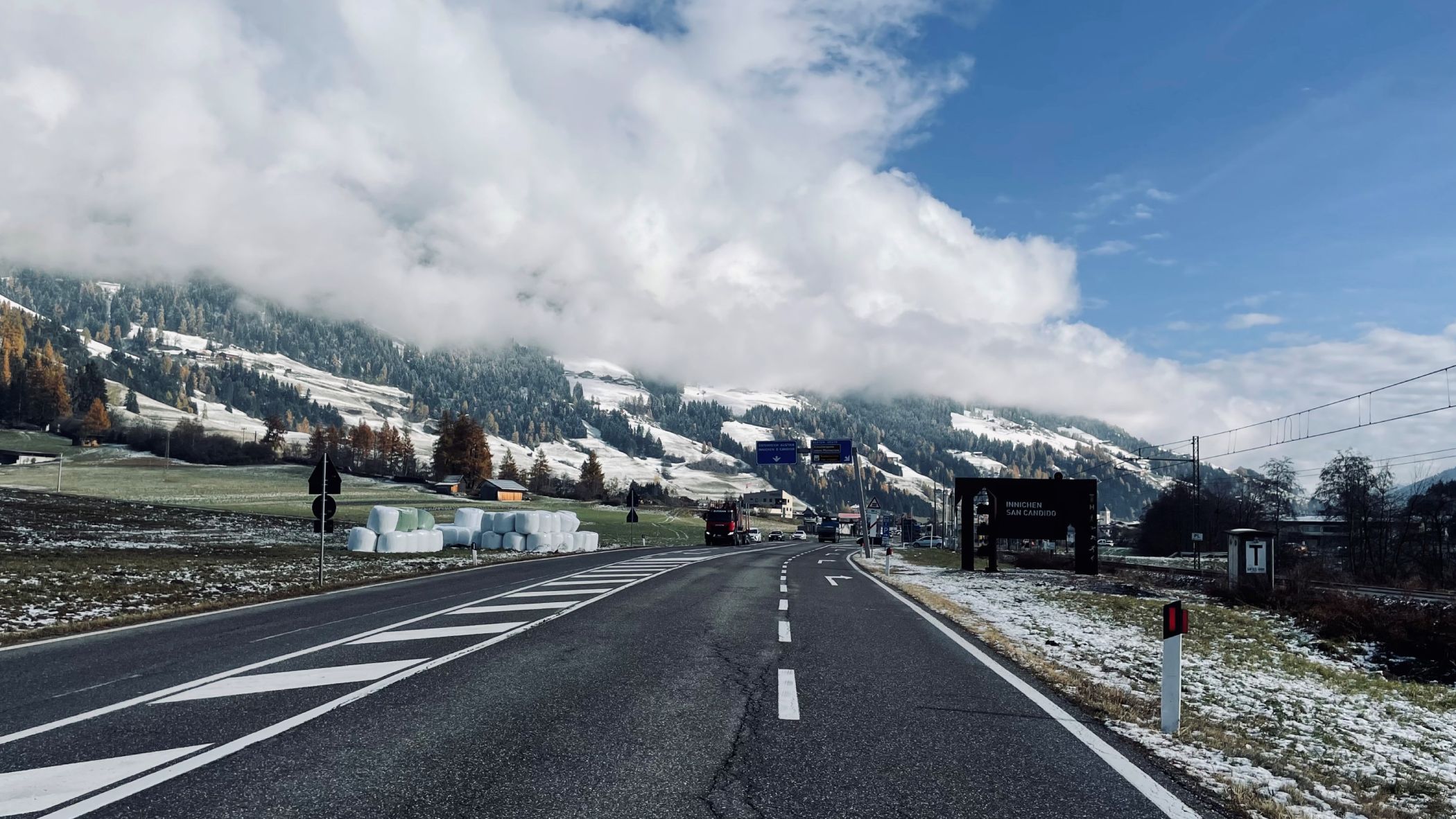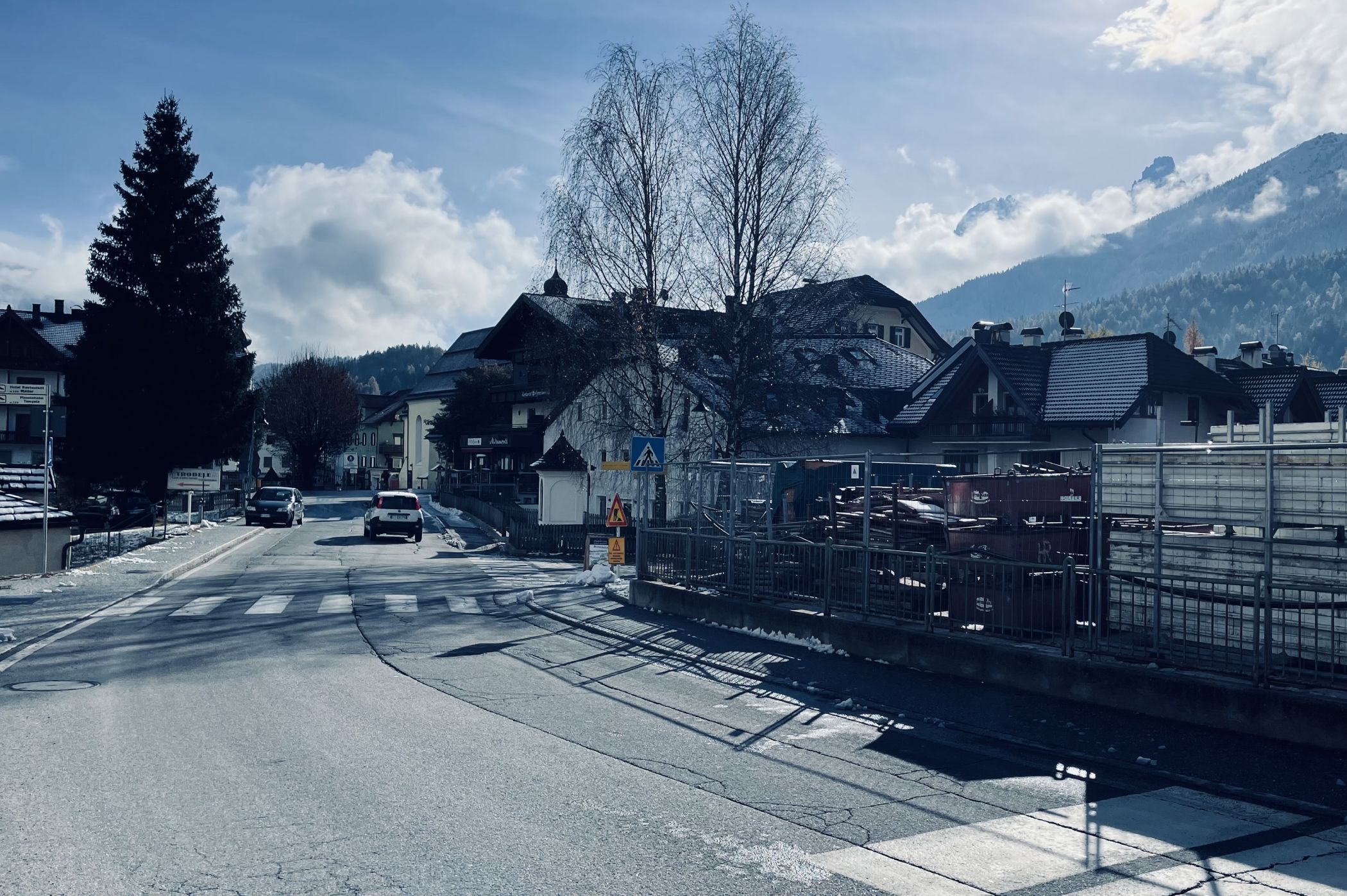 An der Kreuzung fahren Sie gerade aus Richtung Dorfzentrum (Achtung: nicht dem Straßenverlauf Richtung Toblach folgen!)