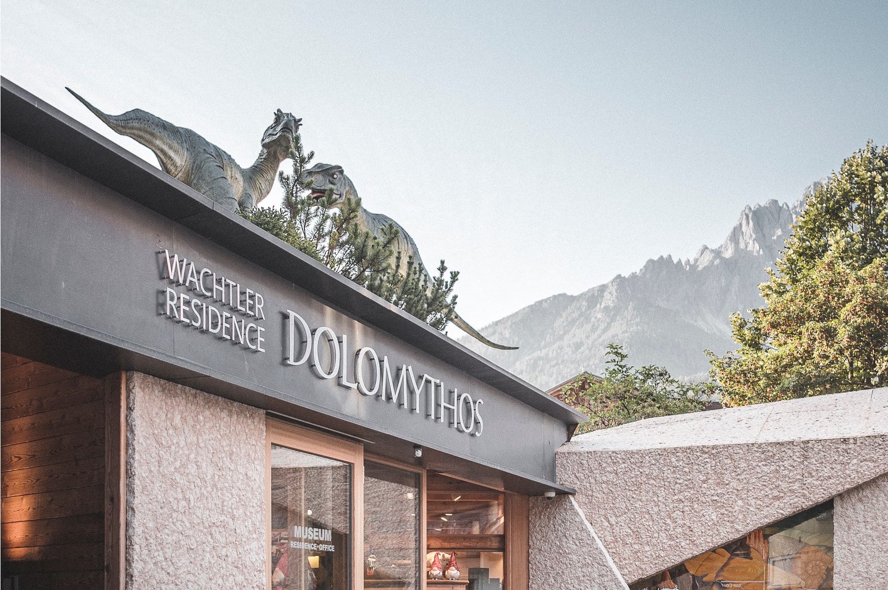 Der Eingang zur Rezeption befindet sich links im Gebäude mit der Aufschrift „Wachtler Residence – Dolomythos“
